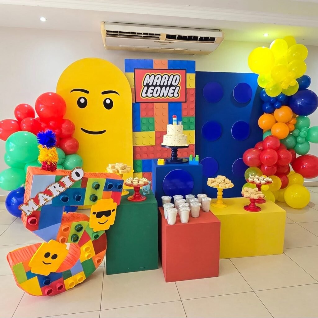 Go big with your decorations for a sensational lego birthday party. This impressive setup features a smiling yellow head, large brick cutouts, and a backdrop customized with the name ‘Mario Leonel’.