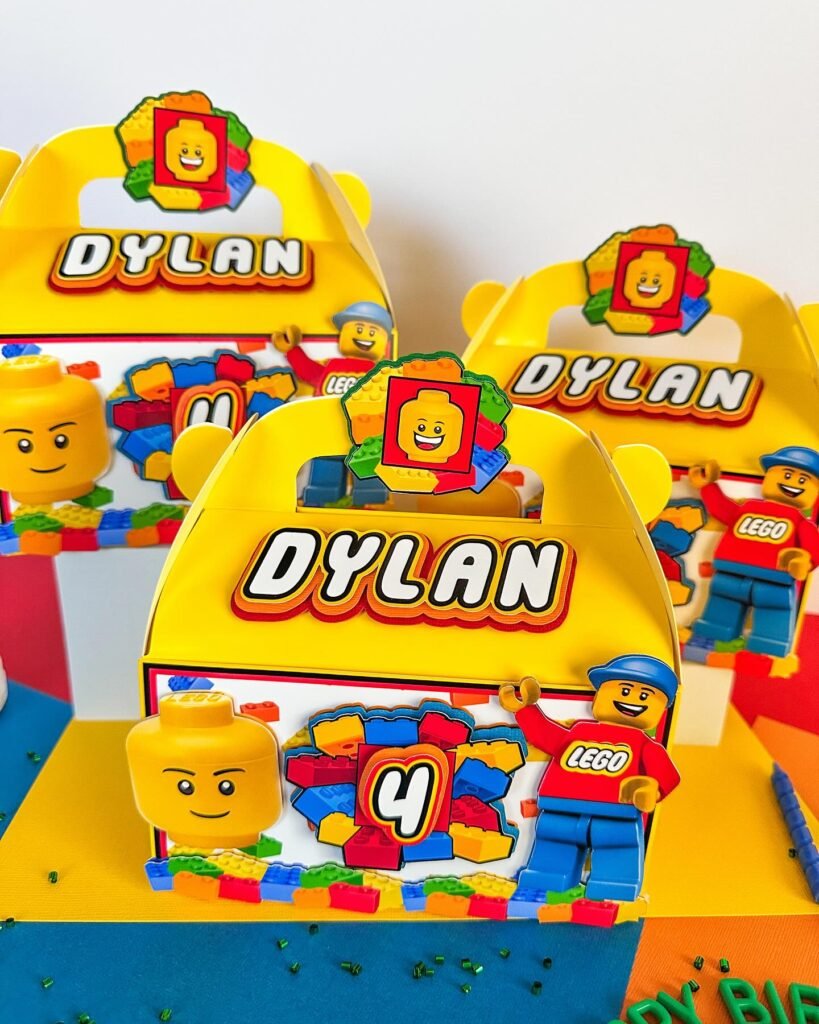 These personalized favor boxes are the lego birthday party accessory every guest will love. Each yellow box is adorned with a custom ‘Dylan’ name tag, making each one feel extra special.
