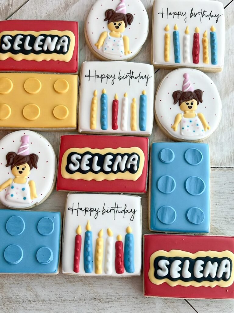 These custom cookies are a delightful addition to any lego birthday party. Each cookie is a tiny work of art, featuring colorful brick shapes in red, yellow, and blue.