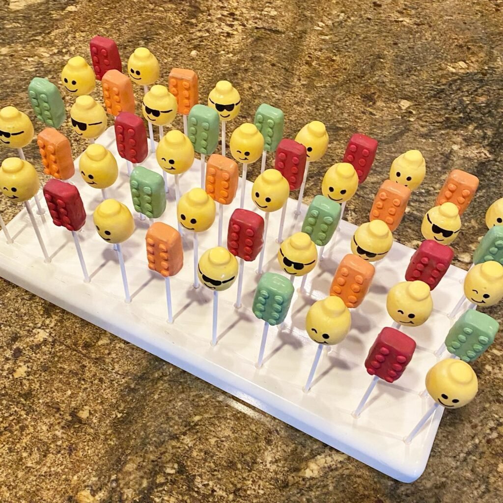 These themed cake pops are a charming treat for any lego birthday party. Each one is a tiny masterpiece, featuring both the iconic brick shape and cheerful character faces.