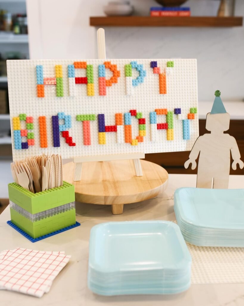 You can easily build the sign yourself and even personalize it with the birthday kid’s name. A simple stack of light blue plates and a reusable brick utensil holder complete the festive look.