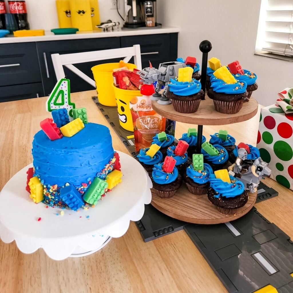 Alongside, a two-tiered stand showcases individual chocolate cupcakes. Each one is topped with blue frosting and more colorful brick candies. Even small toy figures guard the sweet treats.