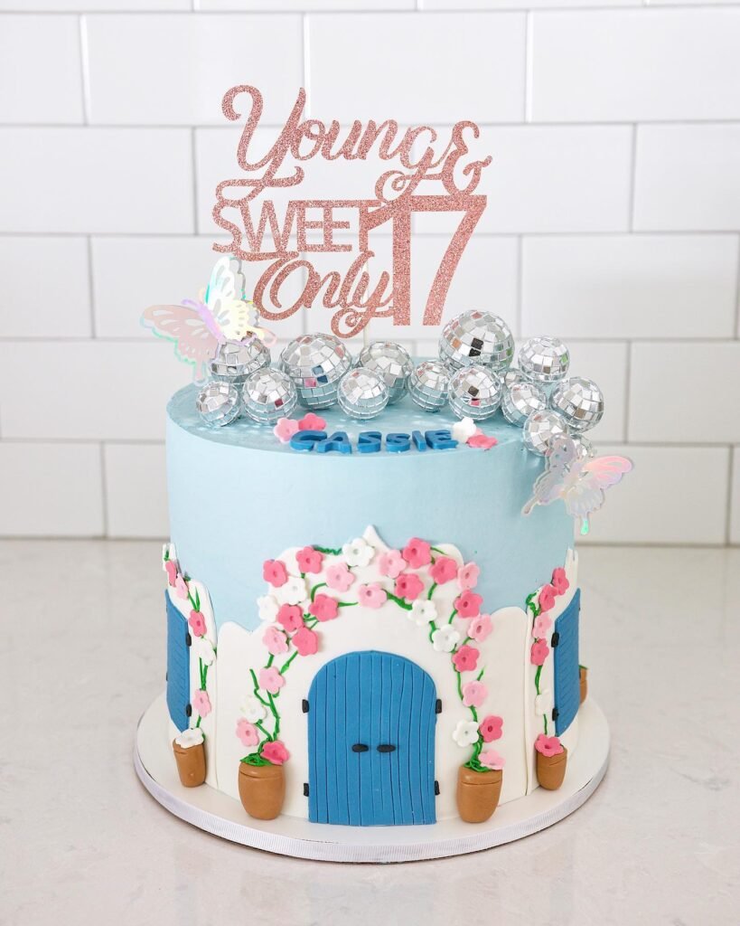 The blue shutters and flowering vines around the base create that authentic Mediterranean village feel. Pink and white fondant flowers cascade down beautifully. It’s sophisticated enough for a teen celebration while still capturing all that Mamma Mia magic we love.