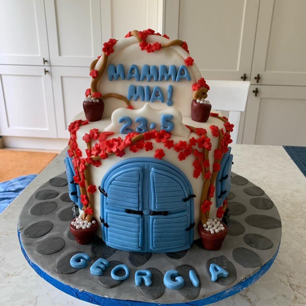 The “MAMMA MIA!” lettering in bright blue really pops, while “GEORGIA” spelled out on the cake board makes it personal. It’s like having a slice of Santorini right on your dessert table!
