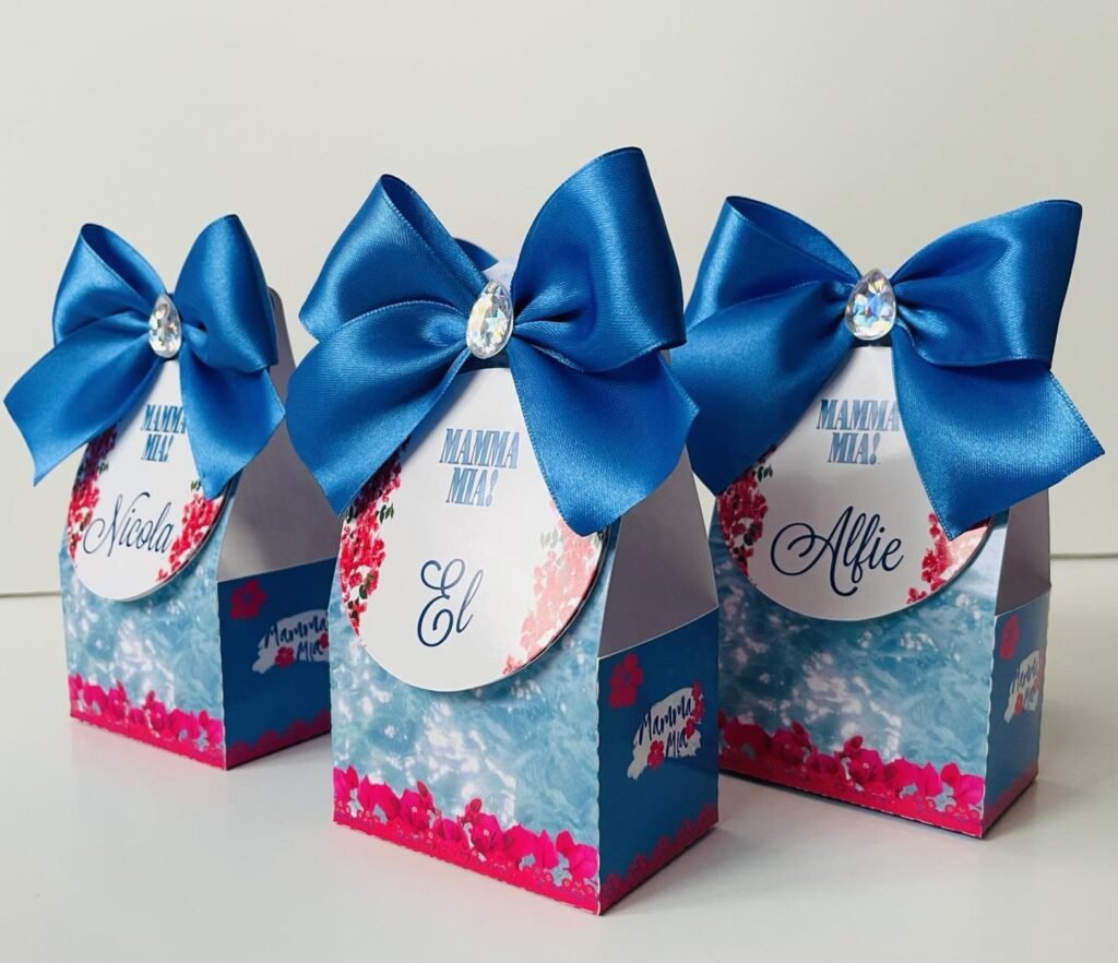 What makes them extra special is how each box can be personalized with guests’ names, making everyone feel like they’re part of the story. Perfect for filling with Greek treats or small ABBA-themed goodies that guests will treasure long after the dancing stops.