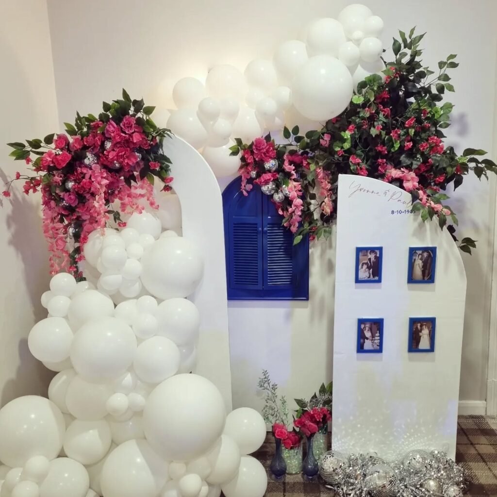 The cascading white balloons create fluffy clouds, while the pink and purple bougainvillea adds that Mediterranean charm.