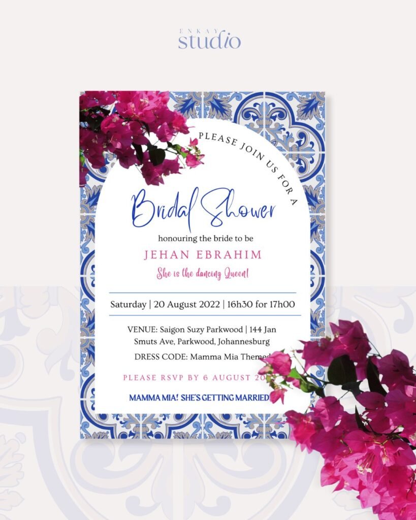 The “Mamma Mia! She’s Getting Married” at the bottom is pure genius – it tells guests exactly what kind of fun, musical celebration they’re in for while keeping the elegant bridal shower vibe intact.
