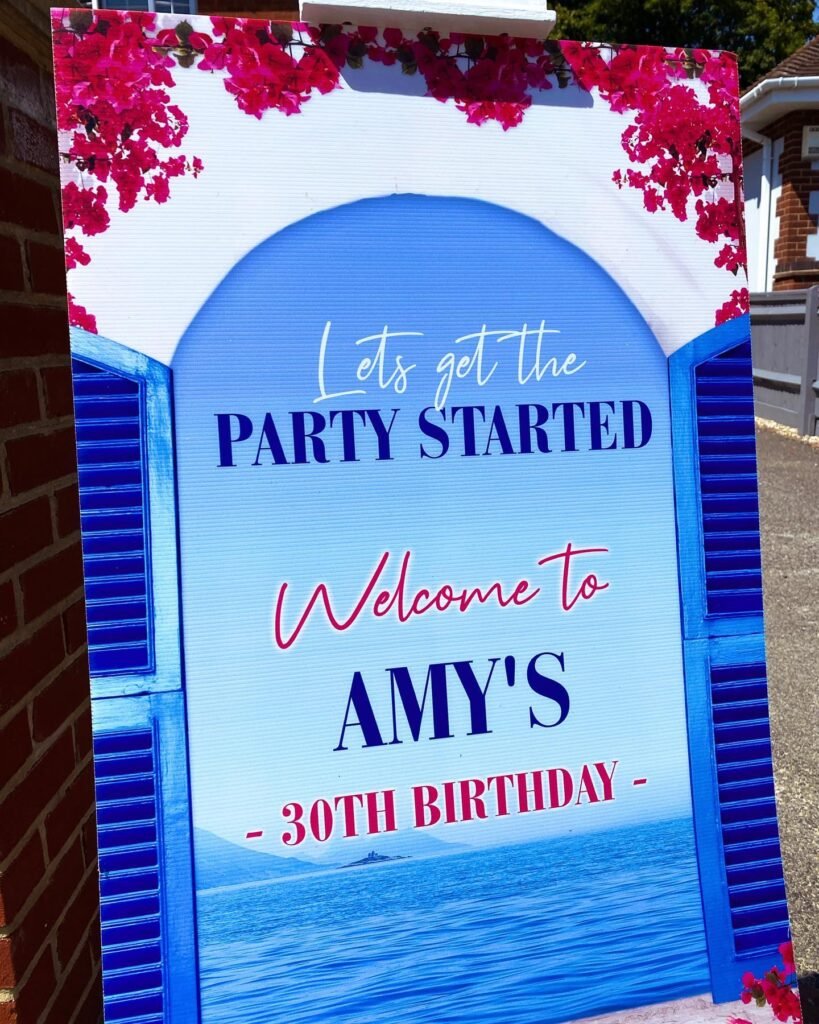 The beautiful blue shutters with cascading pink bougainvillea create that instant Greek island atmosphere. “Let’s get the PARTY STARTED” followed by “Welcome to AMY’S 30th BIRTHDAY” sets such a fun, celebratory tone.