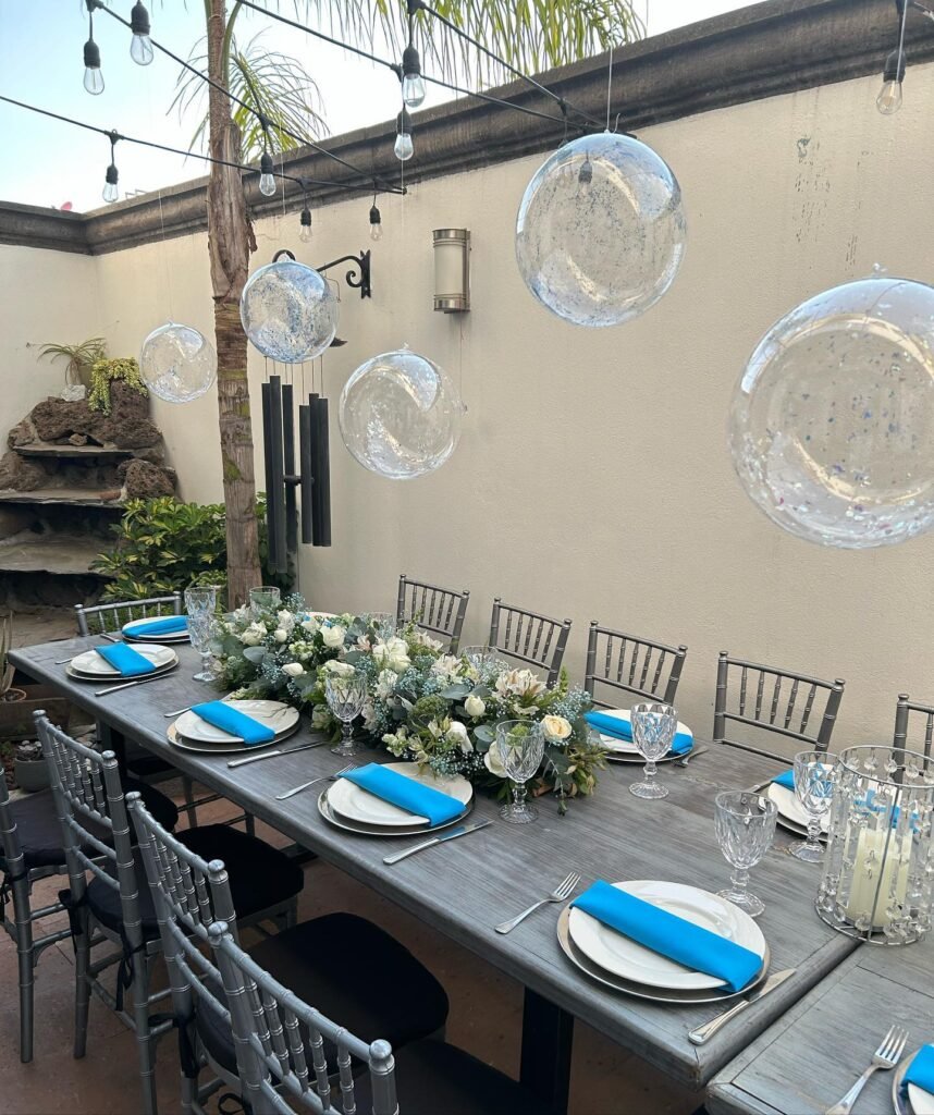 The elegant gray wooden table paired with matching chiavari chairs screams sophistication, while those gorgeous clear glass bubble decorations floating on the wall add such a whimsical, dreamy touch.