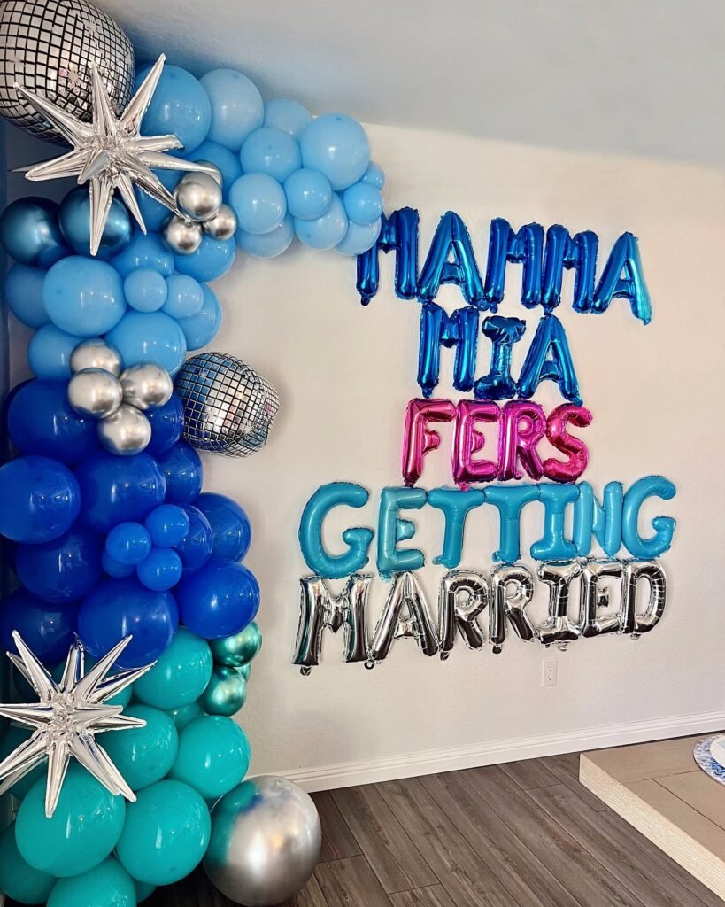 The “MAMMA MIA PERS GETTING MARRIED” balloon letters in blues and silver create such excitement. Those gorgeous star-shaped silver balloons add celestial magic to the whole display.