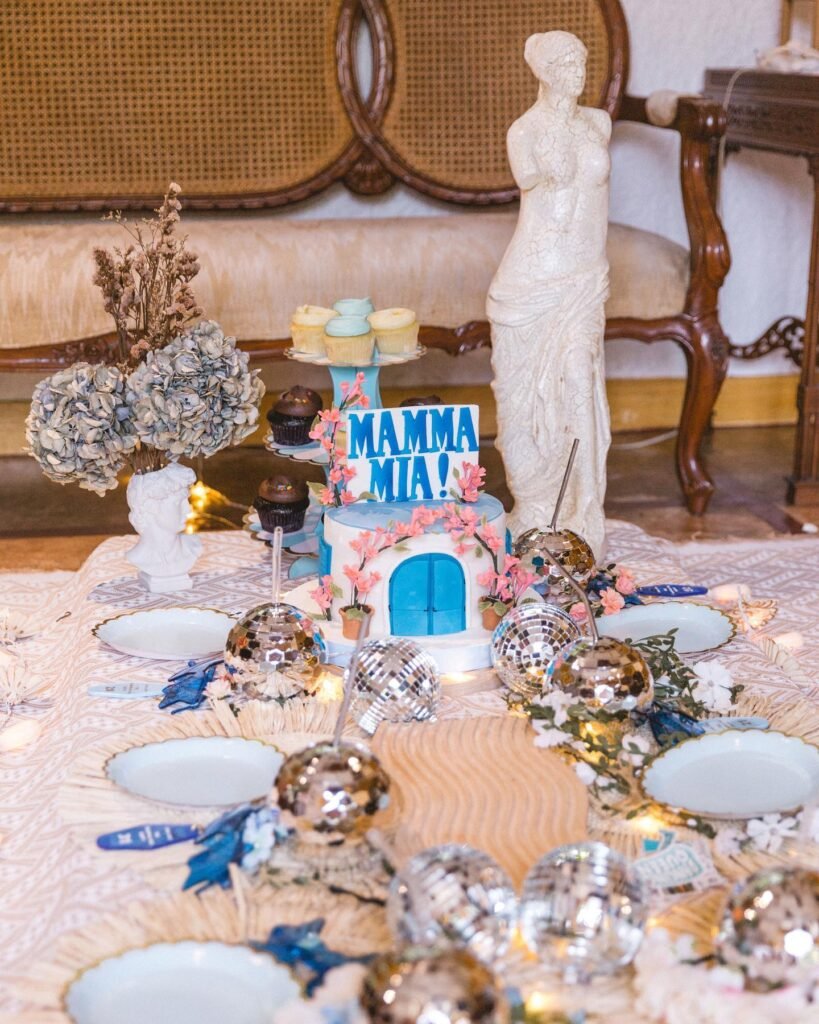 This absolutely stunning dessert table screams luxury with its golden mirror balls scattered everywhere like little disco treasures. The classical statue gives off serious goddess vibes while that adorable Mamma Mia cake sits center stage with its perfect blue door detail.