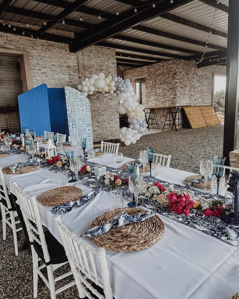 The blue and white patterned table runners paired with woven chargers nail that Greek island aesthetic. Crystal glasses and natural elements like shells and flowers complete the look. It feels like dining in a converted Greek villa where every meal becomes a celebration worth singing about!