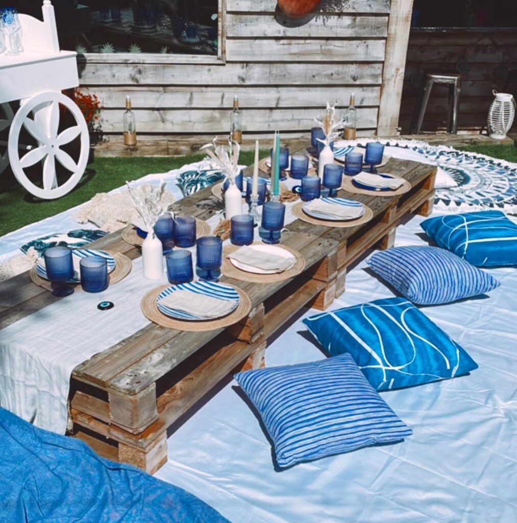 The whole setting looks like it belongs on a Greek island terrace overlooking the sea. Those blue candles and natural elements make it feel so romantic and inviting. It’s exactly where you’d want to share mezze, sing ABBA songs, and create those magical Mamma Mia memories with friends and family.