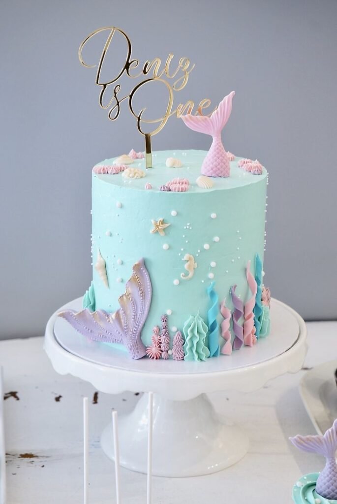 This elegant cake celebrates a first birthday with a whimsical mermaid theme. A stunning golden topper reads, “Deniz is One,” adding a personalized and sophisticated touch to the design.