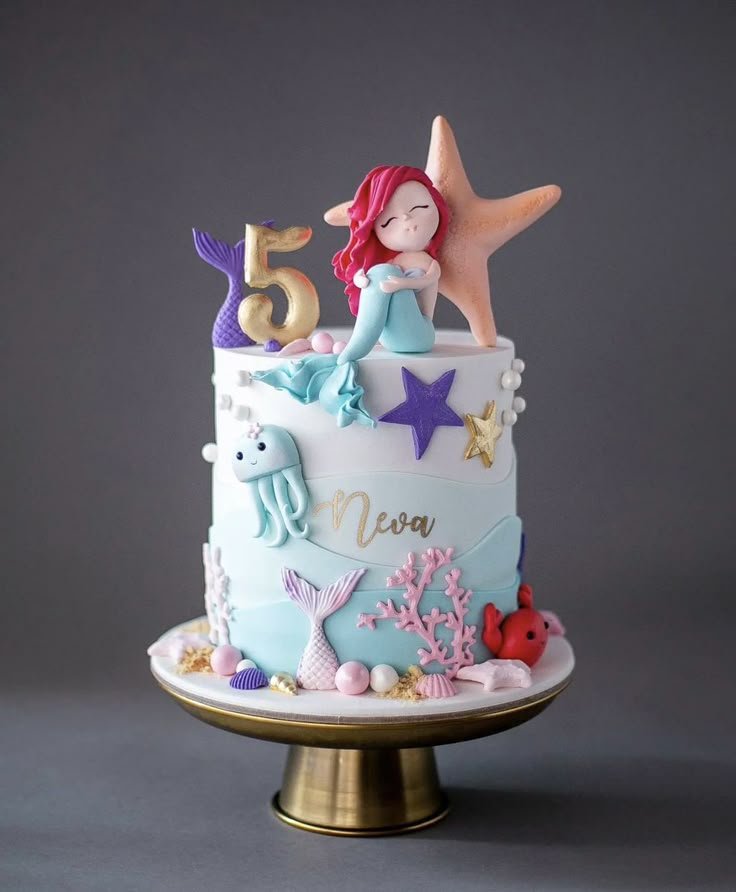 Golden number “5” and shimmering sea stars adorn the top. Light blue fondant waves create a serene ocean backdrop for this mermaid birthday cake.