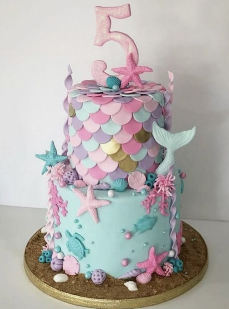 A large, glittering number five and a smaller mermaid tail top the cake, making it a perfect centerpiece. This design is full of enchanting details that bring a fairytale to life.