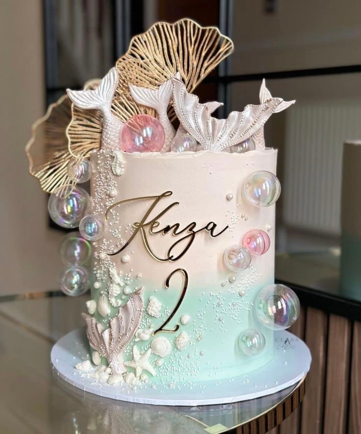 The side of the cake is adorned with golden lettering spelling out “Kenza” and a number “2,” surrounded by intricate seashells and a dusting of silver sparkles. It’s a truly stunning design.