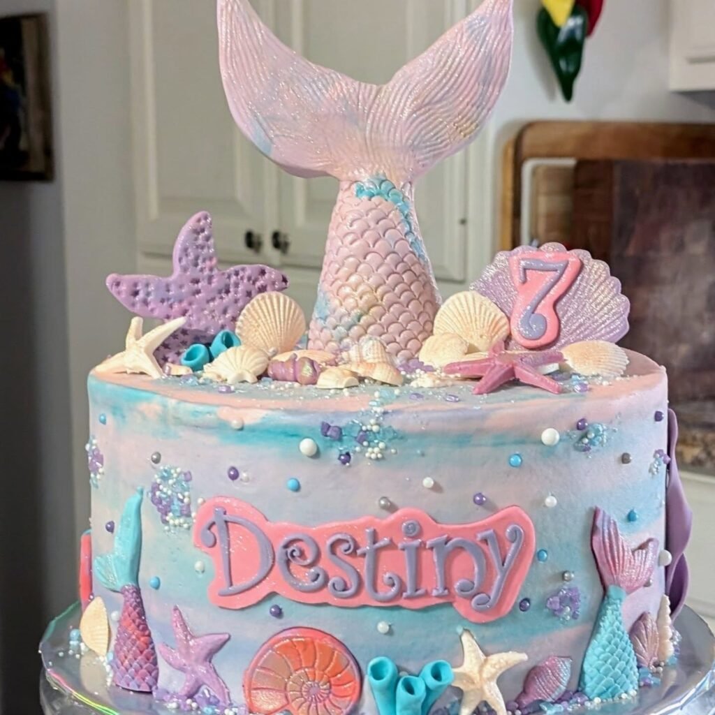 This cake is a vibrant celebration for Destiny’s seventh birthday. A large, shimmering mermaid tail rises from the top, surrounded by edible starfish and an array of seashells.