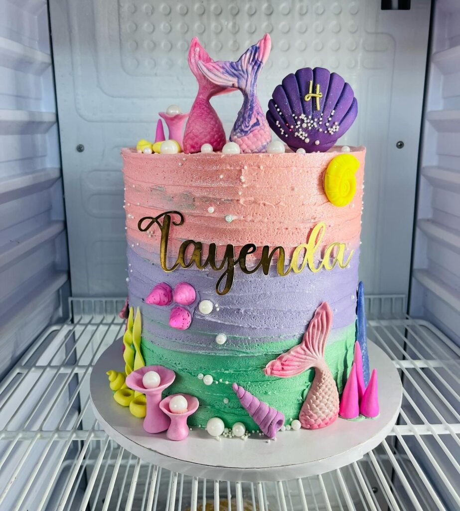 This mermaid birthday cake is a vibrant dream. Ombre frosting in pink, purple, and green creates a soft, oceanic gradient. Golden lettering proudly spells “Tayenda.”