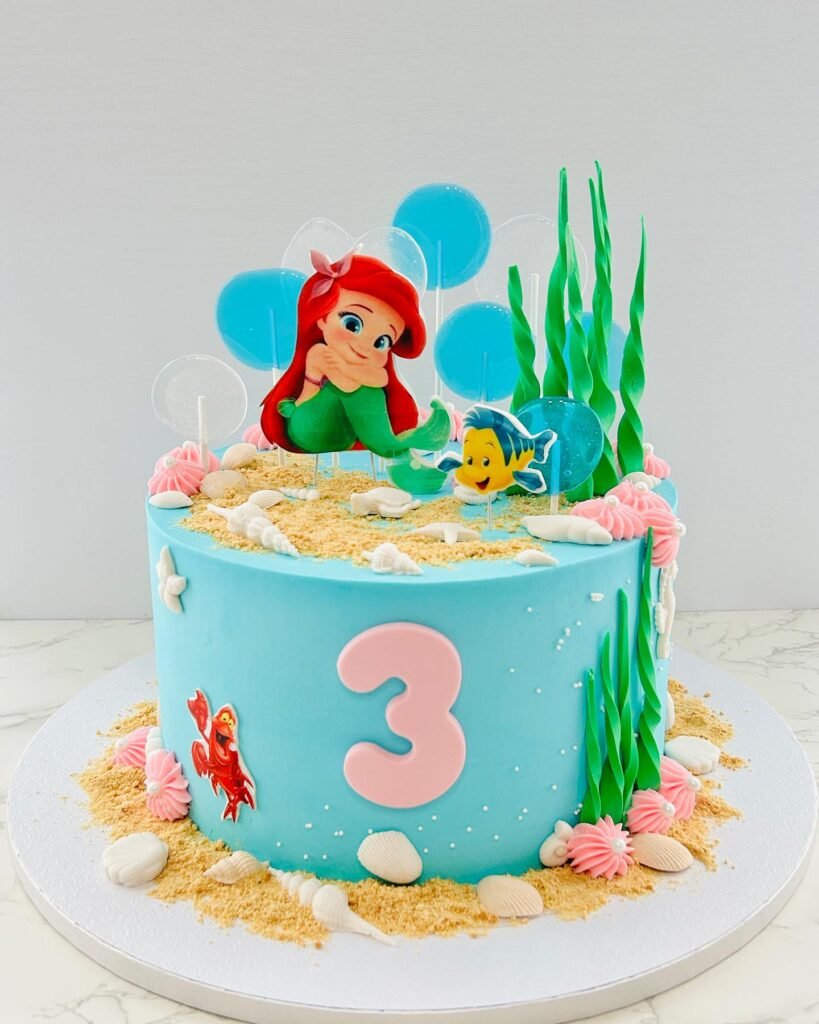 This vibrant cake brings the magic of Ariel’s underwater kingdom to life. A charming Ariel figure, complete with her iconic red hair and green tail, sits gracefully atop the cake. She is surrounded by a whimsical coral garden and playful sea creatures.