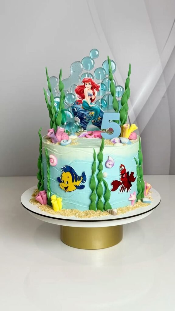 This vibrant cake celebrates a fifth birthday with a fun, undersea theme. It features a cheerful cutout of Ariel alongside her friends Flounder and Sebastian, bringing a playful energy to the design.