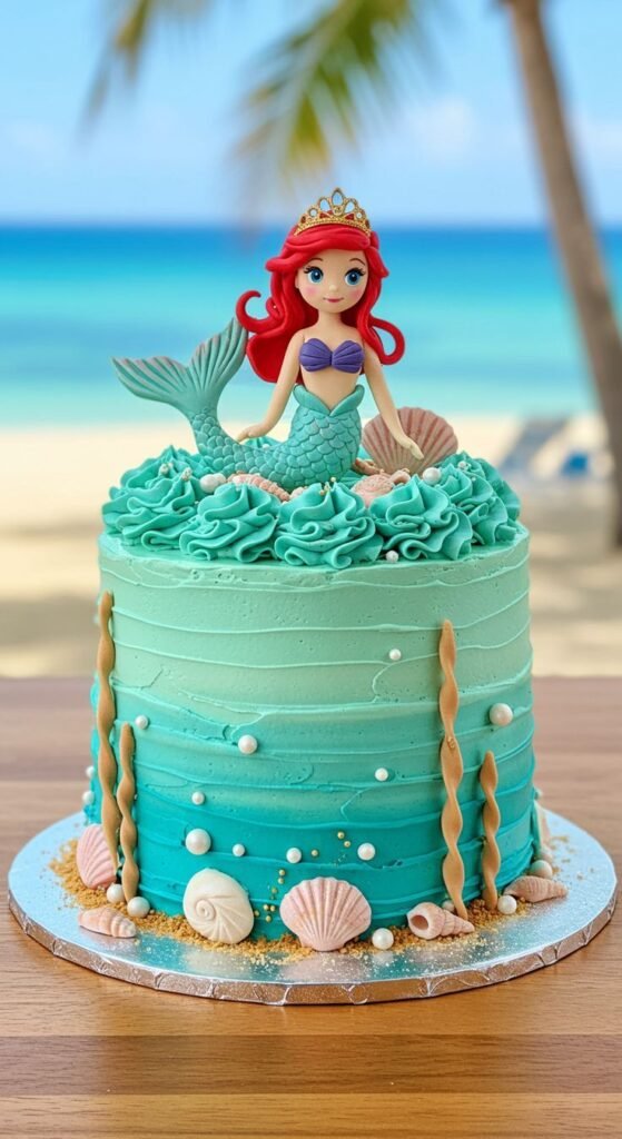 Edible pearls and coral-like accents add to the oceanic theme. This cake is a sweet tribute to the Little Mermaid, making any celebration feel like a trip to the sea.