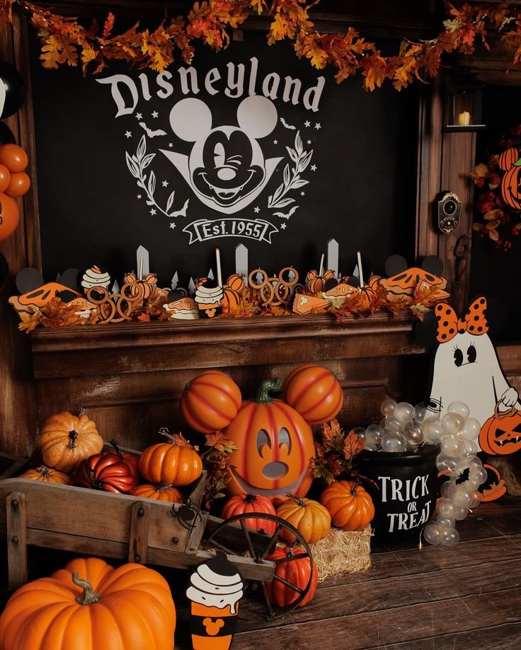 The small details, such as the Disneyland sign and the chalkboard with a pumpkin, add a personal touch. This decor setup provides a warm and inviting feel, making it an excellent source of inspiration for a full-scale mickey’s halloween party.