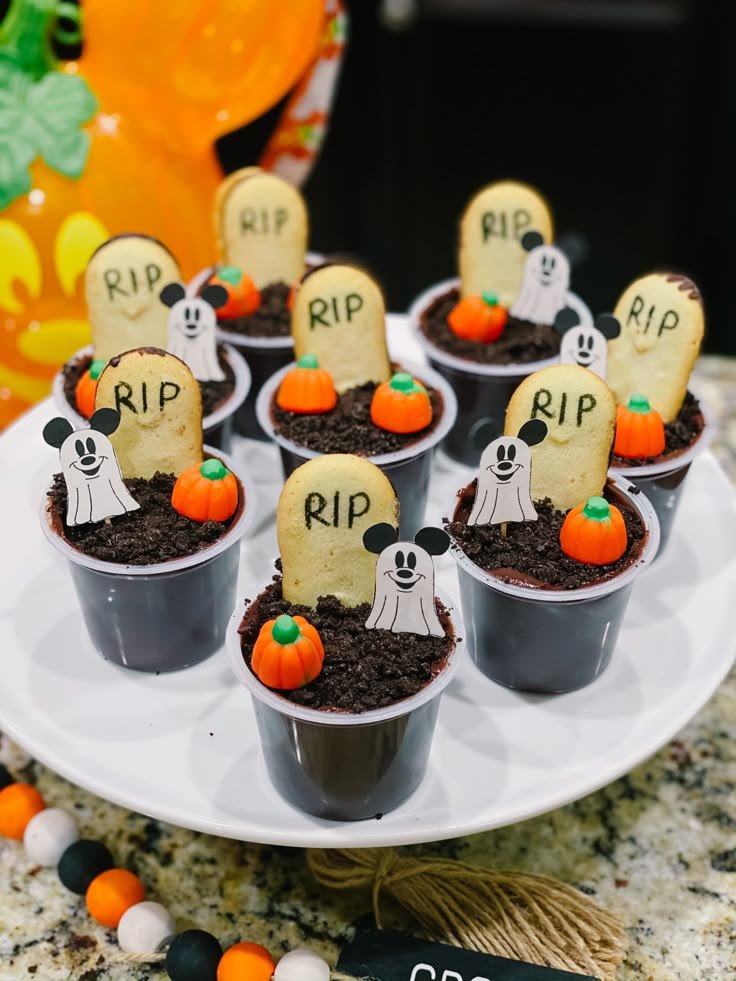 Each cup features a tombstone-shaped cookie with “RIP” written in icing. A ghost cutout with tiny Mickey ears hovers over the tombstone, while a small candy pumpkin sits on the “dirt.” These playful details bring the theme to life.