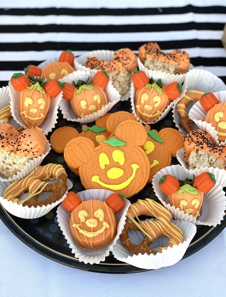 The platter includes Mickey-shaped rice krispie treats, pretzel twists drizzled with orange icing, and chocolate-covered strawberries that look just like tiny pumpkins with ears. The various textures and designs make the platter an eye-catching centerpiece.