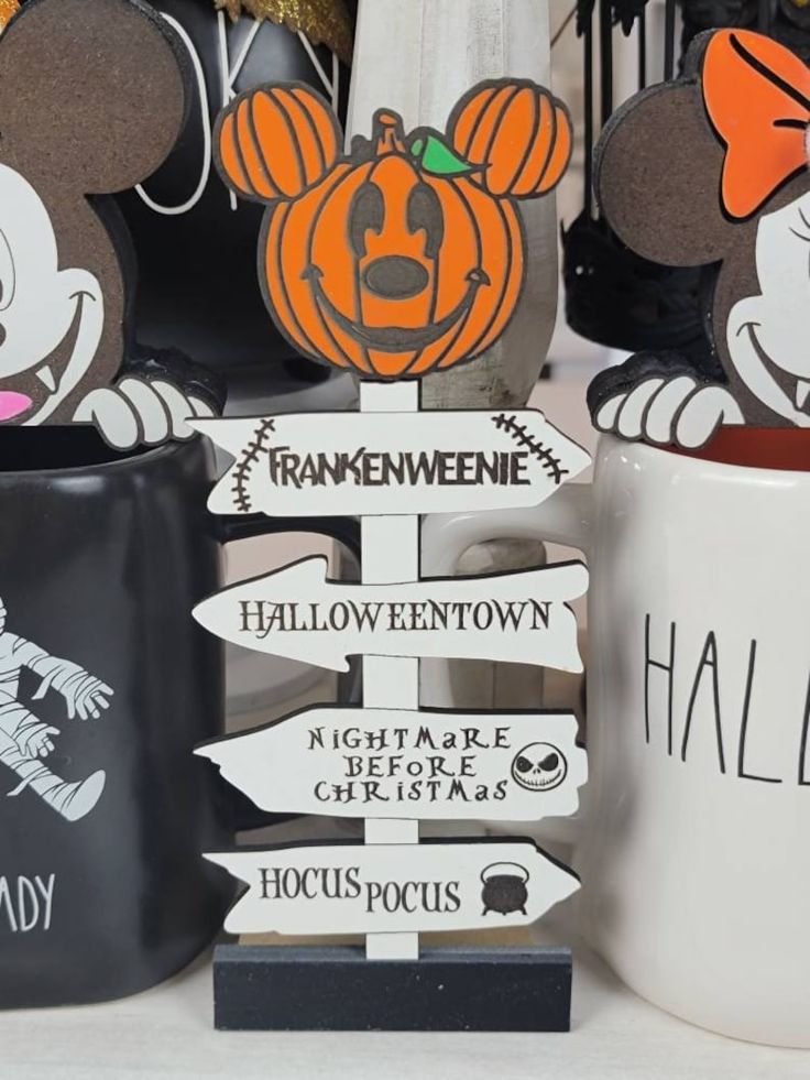 This charming tiered tray decor is a fantastic small-scale example of mickey’s halloween party ideas. A smiling Mickey pumpkin with pumpkin ears sits atop a wooden signpost. Below it, small signs point to iconic Halloween destinations like “Frankenweenie,” “Halloweentown,” and “Hocus Pocus.”