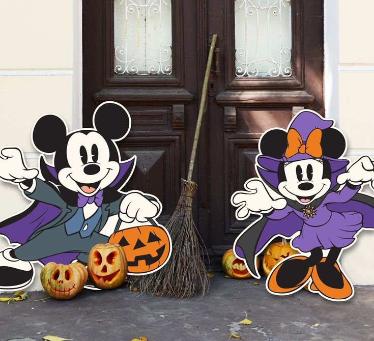 This delightful display of Mickey and Minnie cutouts is a simple yet charming idea for any collection of mickey’s halloween party ideas. Mickey, dressed as a friendly vampire with a cape and bowtie, holds a pumpkin bucket. Minnie, a stylish witch, wears a purple dress with an orange bow and cape.