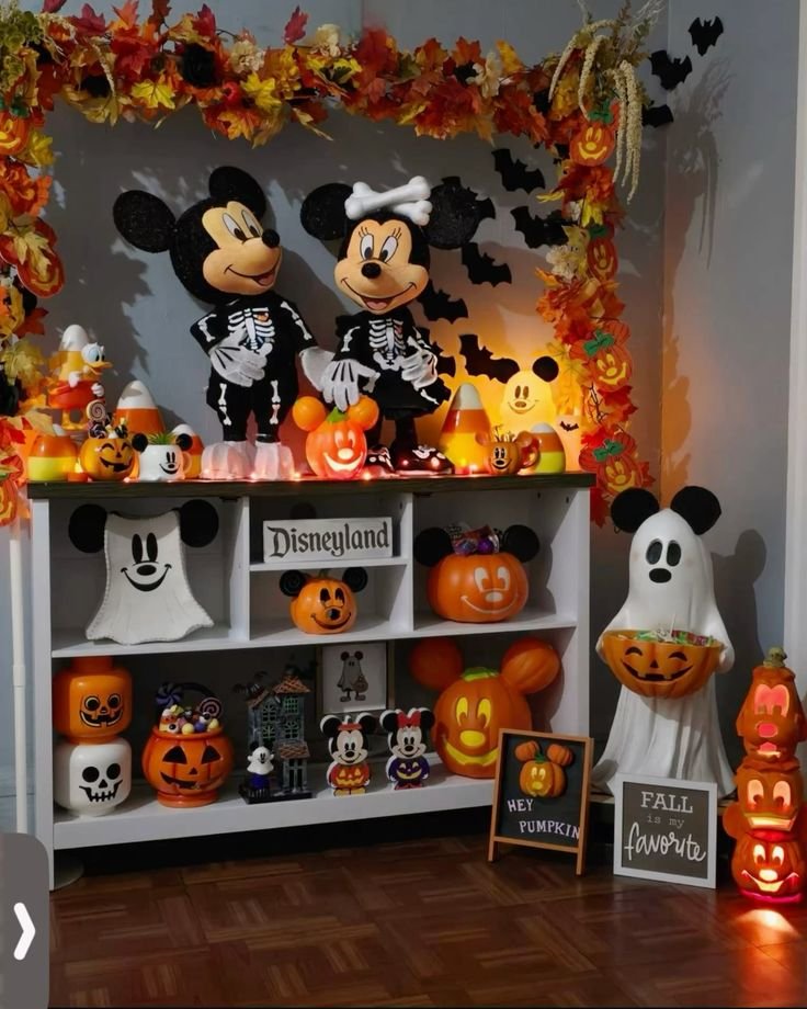 This festive display is a treasure trove of mickey’s halloween party ideas. A garland of autumn leaves and bats frames the top of a shelf unit, creating a cozy and spooky atmosphere. A skeleton Mickey and Minnie stand in the center, ready to celebrate.