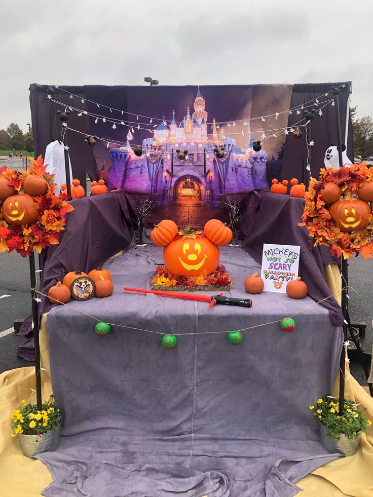 This trunk-or-treat setup is an amazing display of mickey’s halloween party ideas. A backdrop of a spooky, glowing Disney castle sets a magical and eerie scene. The fabric laid over the car trunk resembles a rocky path leading to the castle.