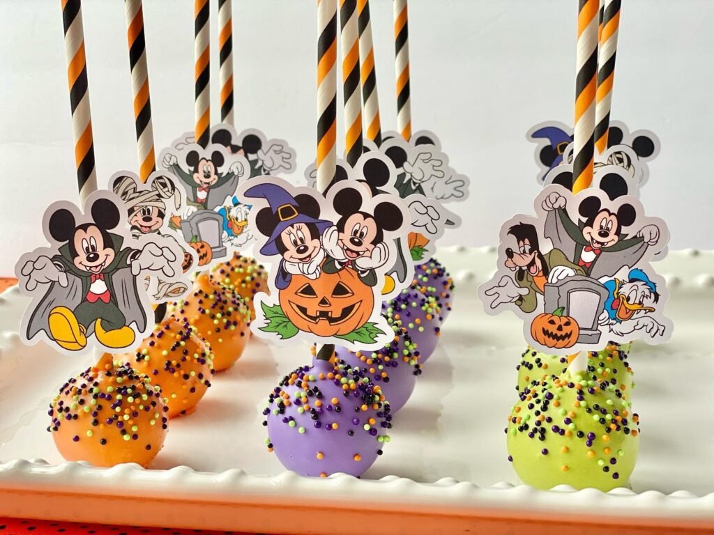 These adorable cake pops are a fantastic addition to any collection of mickey’s halloween party ideas. Each pop is covered in festive orange, green, or purple frosting and coated with colorful sprinkles, creating a fun visual display.