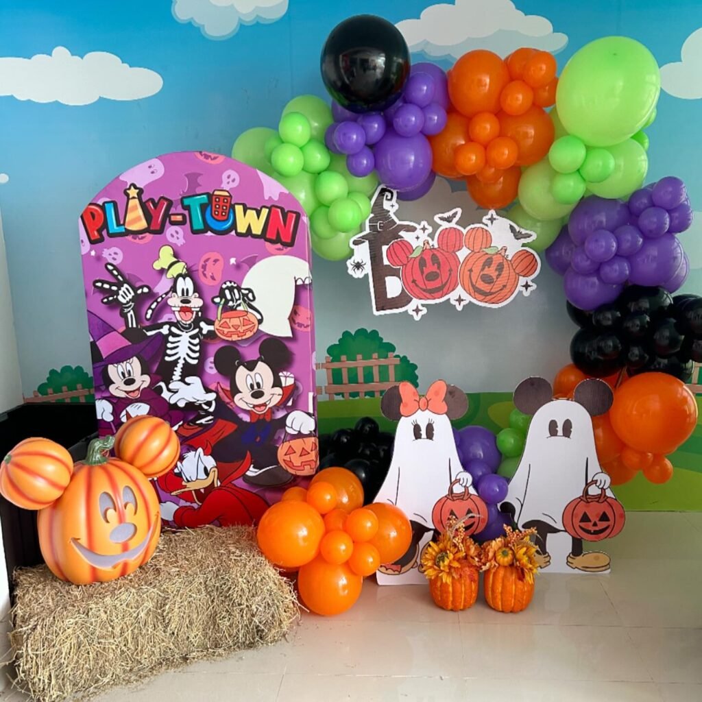 This setup screams mickey’s halloween party ideas with its playful and spooky decorations. A colorful balloon arch in green, purple, orange, and black frames a “Play-Town” sign featuring Mickey and friends in their Halloween costumes. This creates an inviting and exciting party entrance.