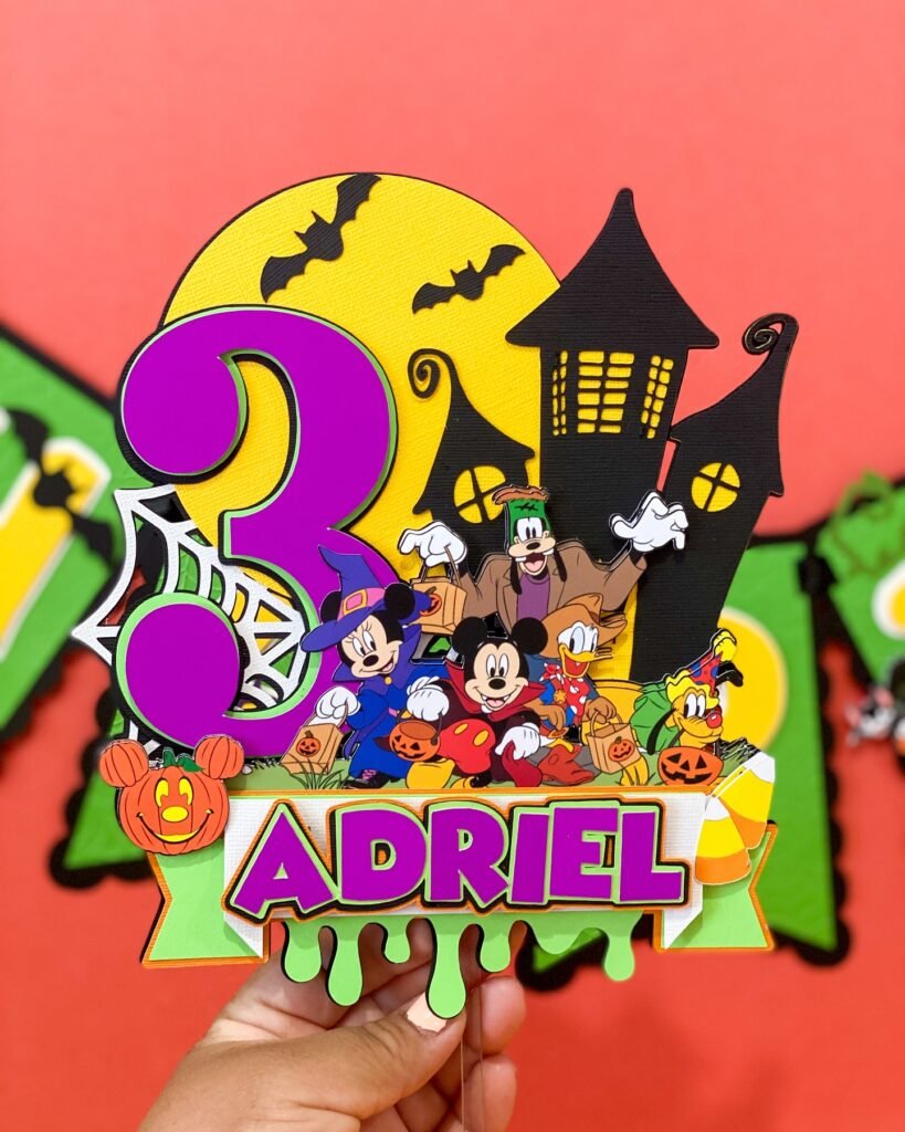 This decoration brilliantly combines birthday festivities with the fun and playful aspects of Halloween. It is a creative and personalized way to enhance a cake and celebrate a significant milestone with a classic mickey’s halloween party theme.