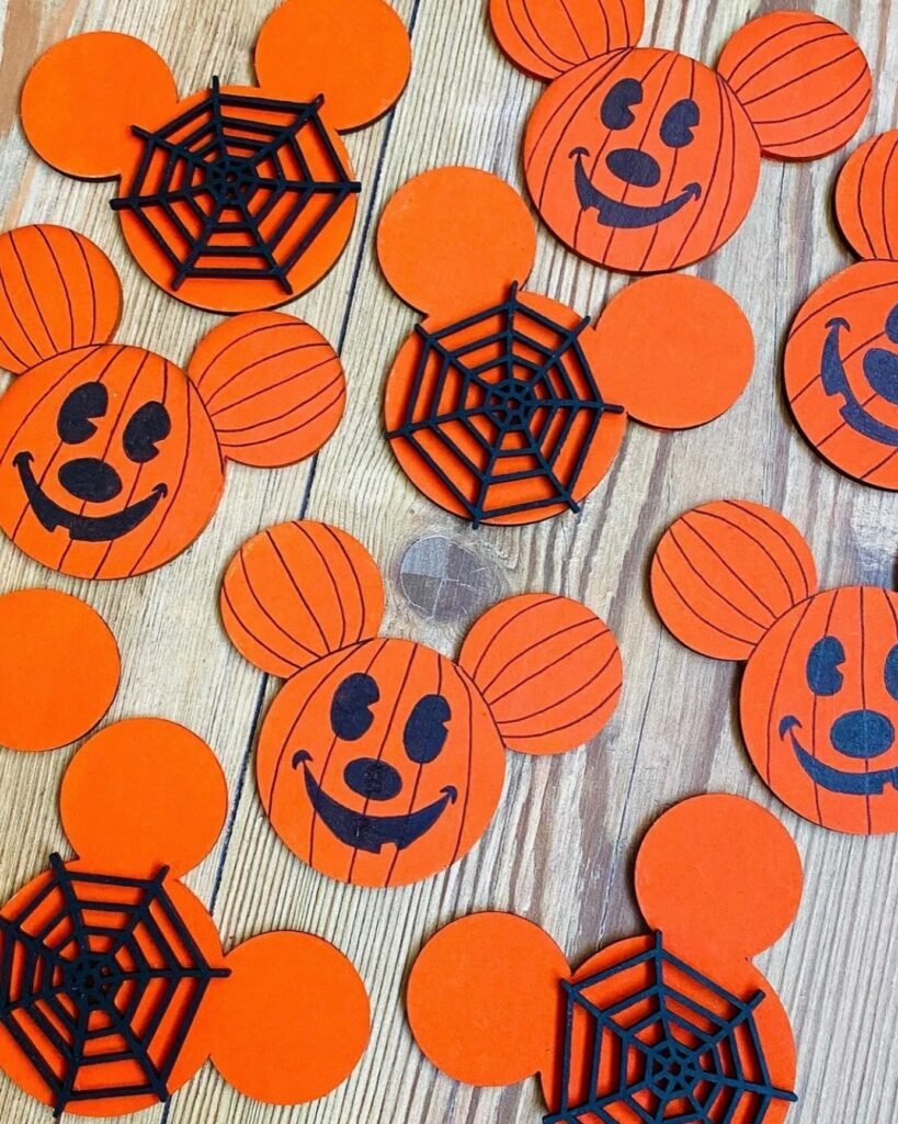 This delightful confetti is a simple yet effective addition to any collection of mickey’s halloween party ideas. The pieces are a mix of smiling Mickey pumpkin heads, solid orange circles, and spooky black spiderwebs.