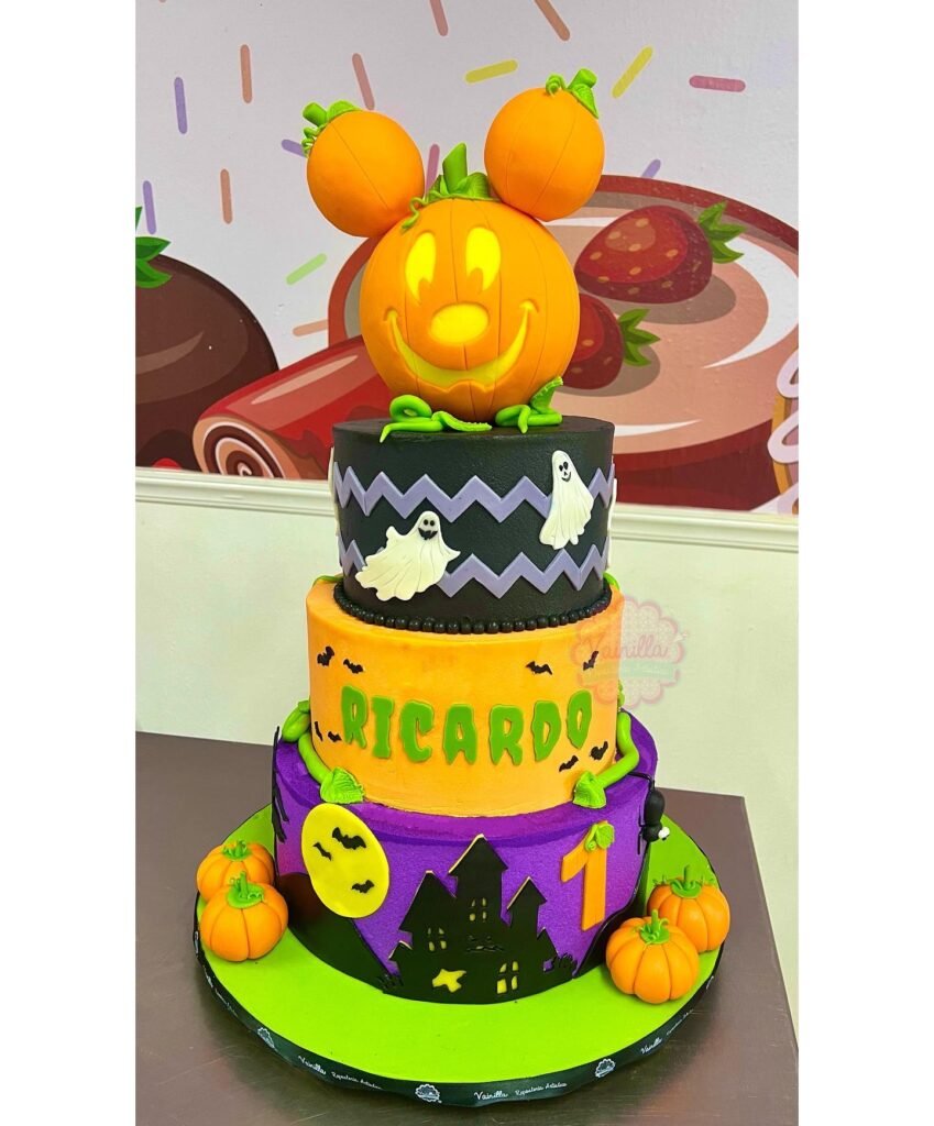 This three-tiered cake is a fantastic centerpiece for mickey’s halloween party ideas. The top tier features a smiling Mickey pumpkin head with pumpkin stem ears, a playful and unique take on the classic Halloween icon.