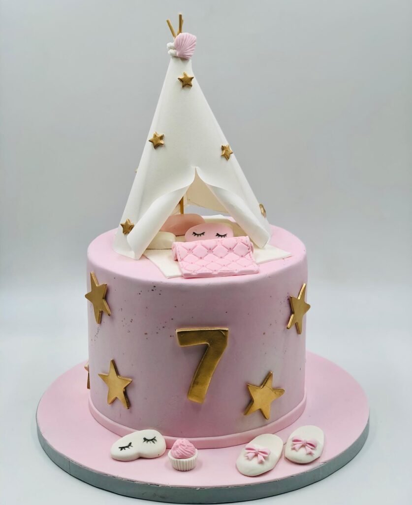 This pink masterpiece captures the essence of childhood wonder with its miniature teepee topper and sleeping figure inside. Golden stars scattered across the fondant surface create a magical nighttime scene that’s perfect for a 7th birthday celebration.
