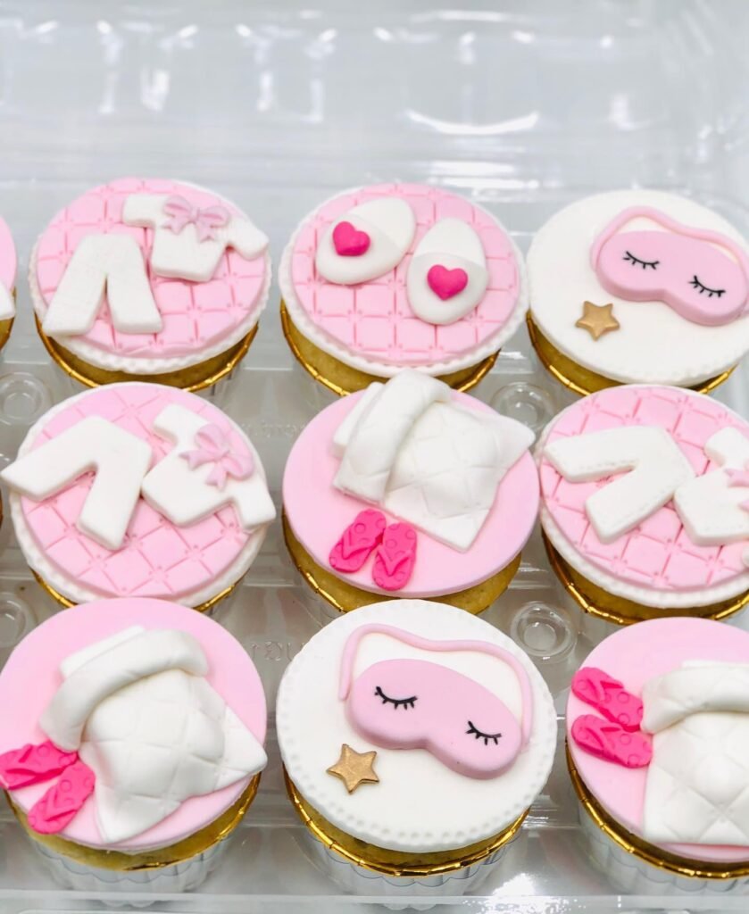 These expertly decorated cupcakes feature every essential sleepover element from fluffy pillows to cozy sleep masks. The consistent pink and white color scheme creates visual harmony while each design offers something unique to discover.