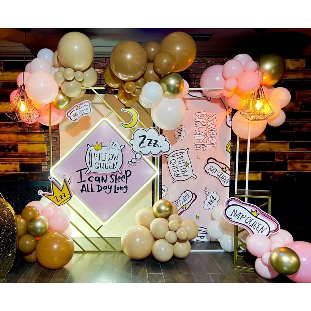 Create the ultimate Instagram-worthy corner with fun sleep-themed props and signage. This playful setup celebrates the art of napping with clever phrases like “I Can Sleep All Day Long” and “Nap Queen” surrounded by golden balloons.