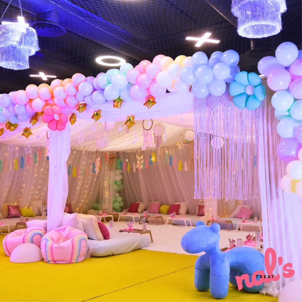 Transform your space into a whimsical wonderland with cascading balloon garlands in soft pastels. This enchanting setup features flowing fabric drapes that create cozy nooks perfect for midnight gossip sessions.