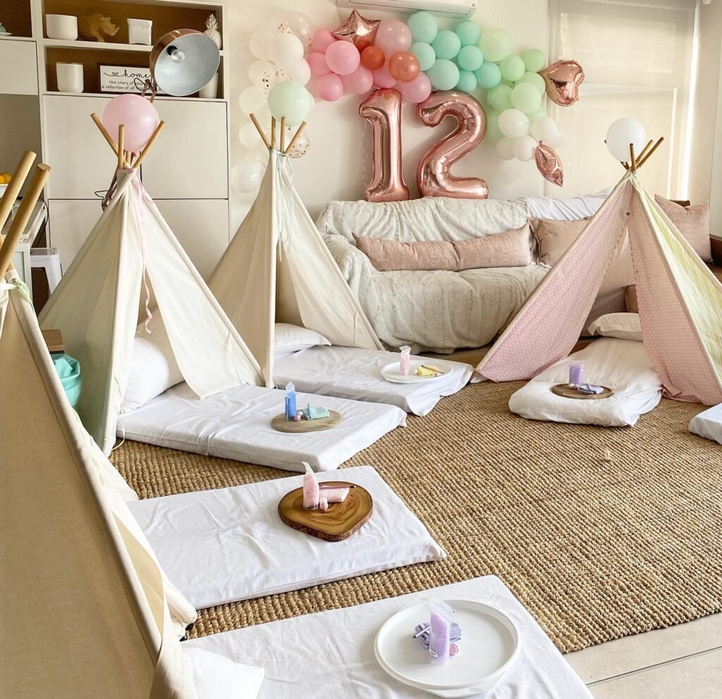 Multiple mini teepees create individual sleeping spaces that feel both private and communal. Each tent comes with soft bedding and personal touches, making every guest feel special on this 12th birthday celebration.