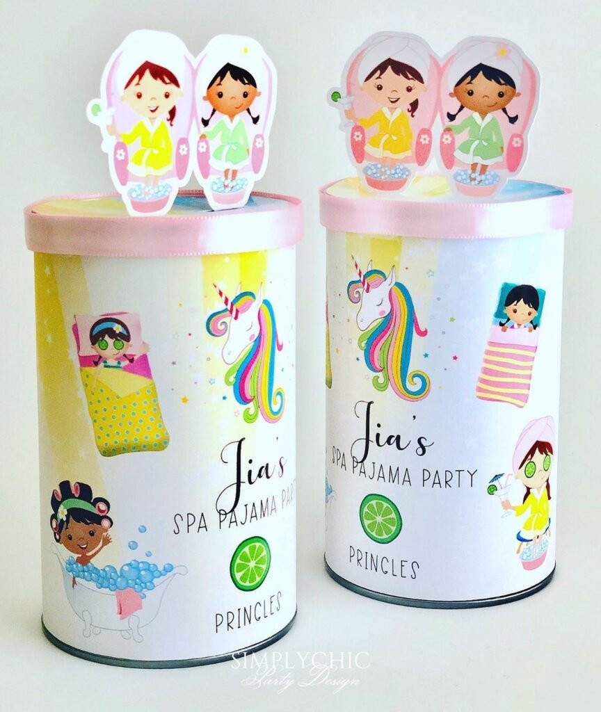 Take the pajama party up a notch with these adorable spa-themed containers that double as both decoration and activity supplies. Each cylinder features cute illustrations of kids enjoying different spa treatments, from bubble baths to face masks, inspiring guests to pamper themselves throughout the evening.