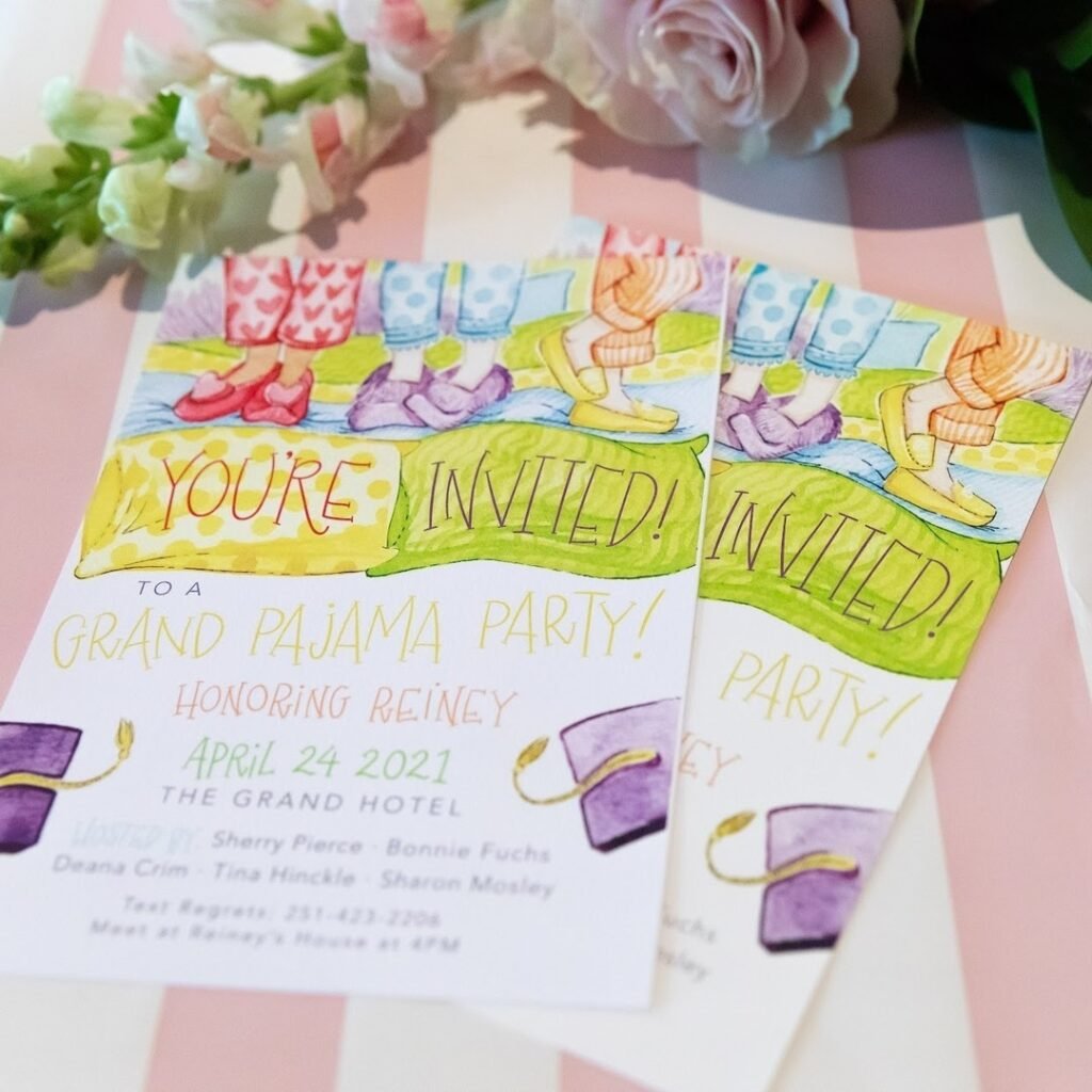 Handcrafted invitations set the perfect tone for your grand pajama party celebration. These watercolor designs feature adorable sleepover imagery like slippers, pillows, and cozy blankets that immediately communicate the theme.