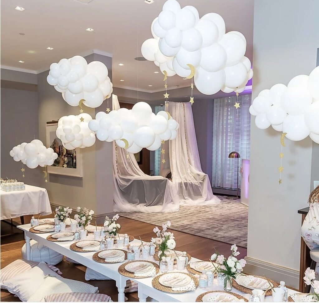 Floating white balloon clouds create a magical dining atmosphere that transforms any room into a dreamy sky palace. The elegant table setting proves that pajama parties can be both comfortable and sophisticated.
