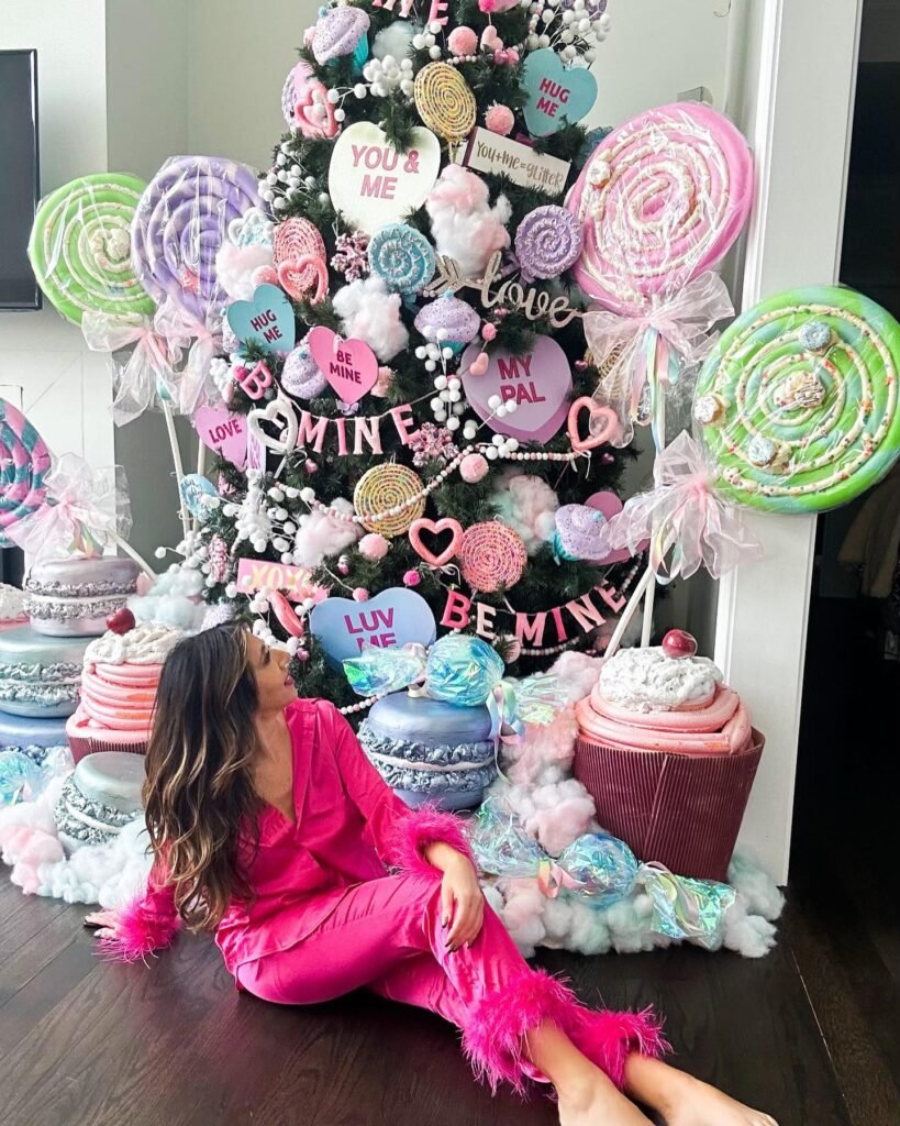 The Christmas tree gets a pajama party makeover with oversized lollipops, conversation hearts, and sweet messages. Pink and mint color schemes create a dreamy atmosphere that’s perfect for February celebrations.