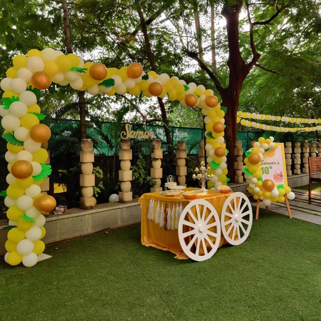 The decorative balloon arch frames a charming dessert cart, making it the centerpiece everyone notices. Paper lanterns and matching decorations continue the citrus theme throughout the space.
