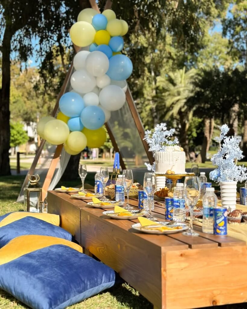 The wooden table setup with blue velvet cushions creates an upscale picnic atmosphere that impresses guests. Balloon clusters add playful touches without overwhelming the elegant design.