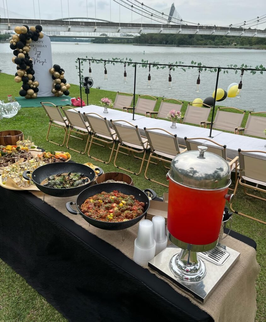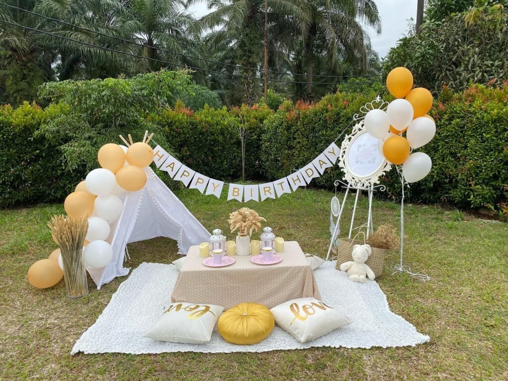 Golden and black balloon decorations add a touch of glamour to the natural setting. It’s proof that birthday celebrations don’t need indoor venues to feel special and memorable.